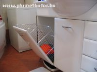Szappanmart frontok, tükörre merőlegesen üveg polcok ragasztva. Beépített termékek: billenős szennyestartó.